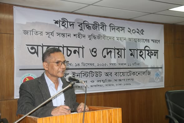 আজ (১৪/১২/২০২৫) সকাল ১১.৩০ মিনিটে ন্যাশনাল ইনস্টিটিউট অব বায়োটেকনোলজি (এনআইবি)-তে মহান শহীদ বুদ্ধিজীবী দিবস উপলক্ষে আলোচনা সভা ও দোয়া মাহফিল অনুষ্ঠিত হয়। অনুষ্ঠানে এনআইবি’র মহাপরিচালক অধ্যাপক ড. মো: ছগীর আহমেদ এবং প্রতিষ্ঠানের সকল বিজ্ঞানী ও সংশ্লিষ্ট কর্মকর্তাবৃন্দ উপস্থিত ছিলেন।