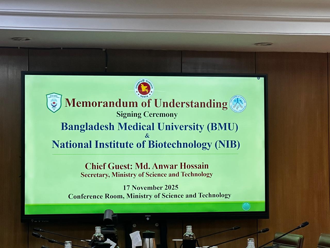 অদ্য ১৭ নভেম্বর ২০২৫ তারিখে বাংলাদেশ মেডিকেল বিশ্ববিদ্যালয় এবং ন্যাশনাল ইনস্টিটিউট অব বায়োটেকনোলজি এর মধ্যে গুরুত্বপূর্ণ সমঝোতা স্মারক (MoU) স্বাক্ষর অনুষ্ঠান অনুষ্ঠিত হয়। উক্ত স্মারকে নিজ নিজ প্রতিষ্ঠানের পক্ষে BMU-এর মাননীয় উপাচার্য (ভারপ্রাপ্ত) প্রফেসর ড. মোঃ শাহীনুল আলম এবং NIB-এর মহাপরিচালক, প্রফেসর ড. মোঃ ছগীর আহমেদ স্বাক্ষর করেন।