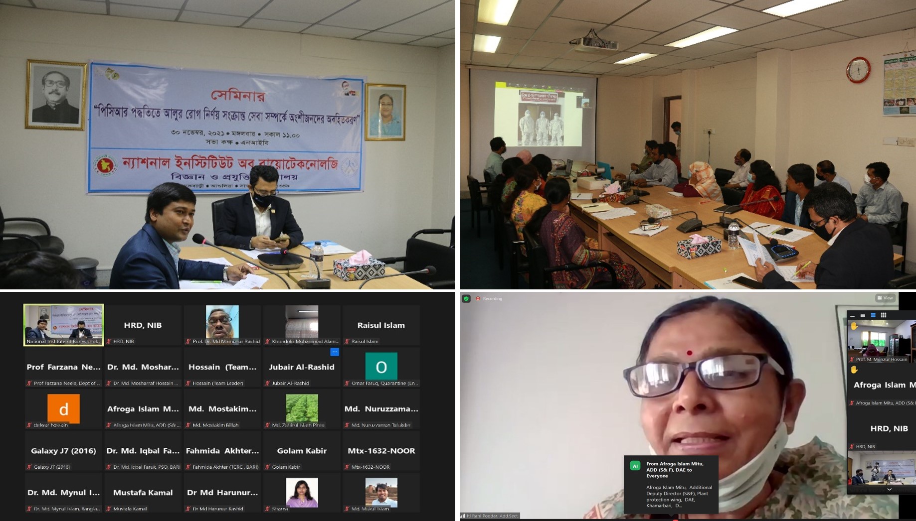 “পিসিআর পদ্ধতিতে আলুর রোগ নির্ণয় সংক্রান্ত সেবা সম্পর্কে অংশীজনদের অবহিতকরণ” শীর্ষক একটি সেমিনার ভিডিও কনফারেন্সিং এর মাধ্যমে গত ৩০ নভেম্বর, ২০২১ তারিখে ন্যাশনাল ইনস্টিটিউট অব বায়োটেকনোলজিতে অনুষ্ঠিত হয়। সেমিনারে উপস্থিত ছিলেন ন্যাশনাল ইনস্টিটিউট অব বায়োটেকনোলজি’র মহাপরিচালক ড. মো. সলিমুল্লাহ, ড. জাহাঙ্গীর আলম, চিফ সায়েন্টিফিক অফিসার ও প্রকল্প পরিচালক, জাতীয় জীন ব্যাংক স্থাপন প্রকল্প, এনআইবি’র গবেষণা বিভাগের বিভাগীয় প্রধান/বিভাগীয় ইনচার্জগণ, এপিএ ফোকাল পয়েন্ট, শুদ্ধাচার ফোকাল পয়েন্ট এবং এনআইবি’র সংশ্লিষ্ট গবেষকবৃন্দ। উক্ত সেমিনারে বিভিন্ন সরকারী ও বেসরকারী গবেষণা প্রতিষ্ঠানে কর্মরত গবেষক, বিশ্ববিদ্যালয়ের শিক্ষক এবং এনআইবির কর্মকর্তাগণ সহ মোট ৪০ জন প্রতিনিধি ভিডিও কনফারেন্স এর মাধ্যমে সংযুক্ত হন। অনুষ্ঠান আয়োজনে ছিলেন প্ল্যান্ট বায়োটেকনোলজি বিভাগের ঊর্ধ্বতন বৈজ্ঞানিক কর্মকর্তা ও বিভাগীয় প্রধান জনাব শামিমা নাছরীন এবং উপস্থাপনায় ছিলেন জনাব হাবিবুন নবী ফরহাদ, সেমিনার কোঅর্ডিনেটর ও বিভাগীয় ইনচার্জ, প্রশিক্ষণ বিভাগ।